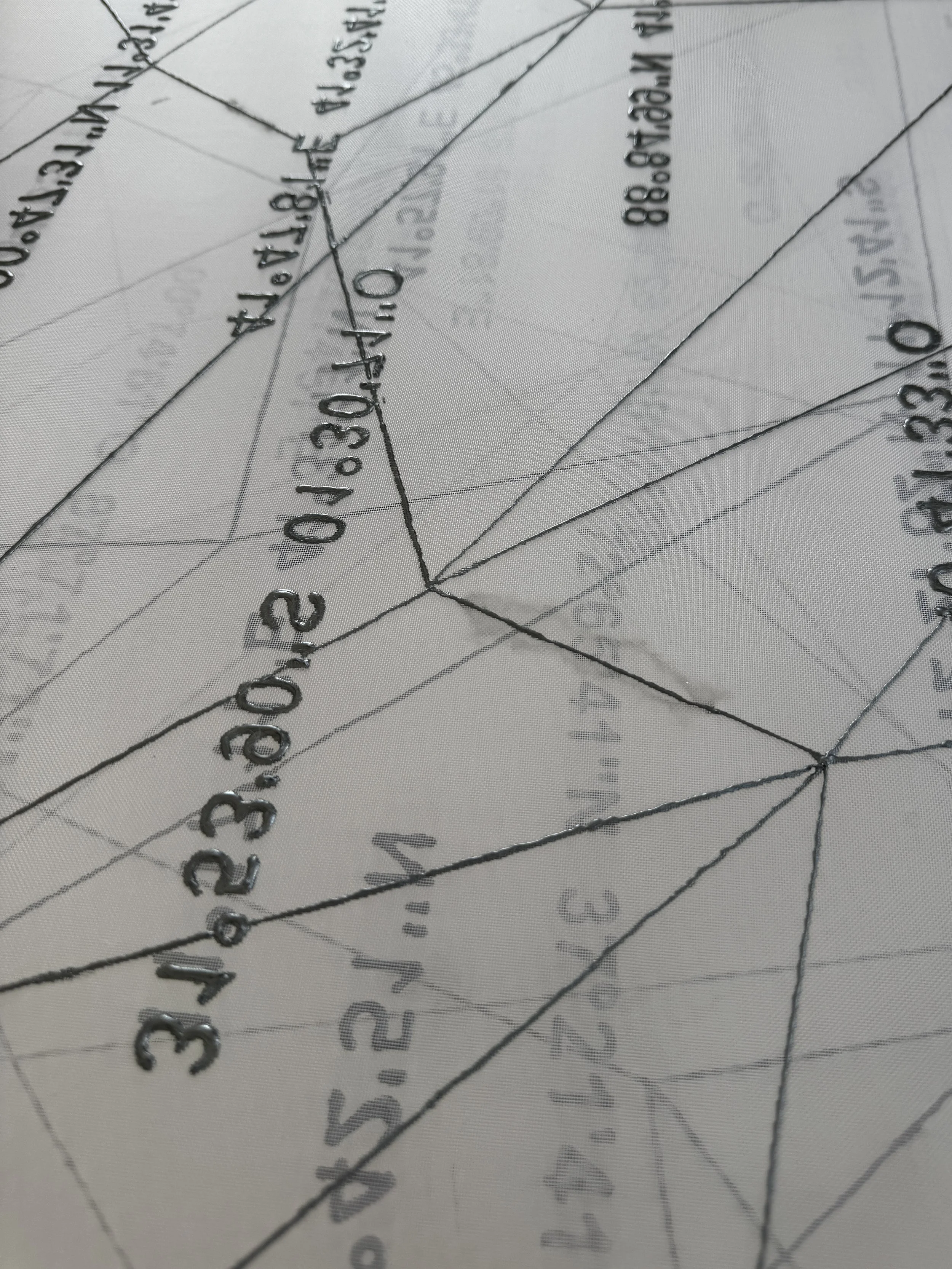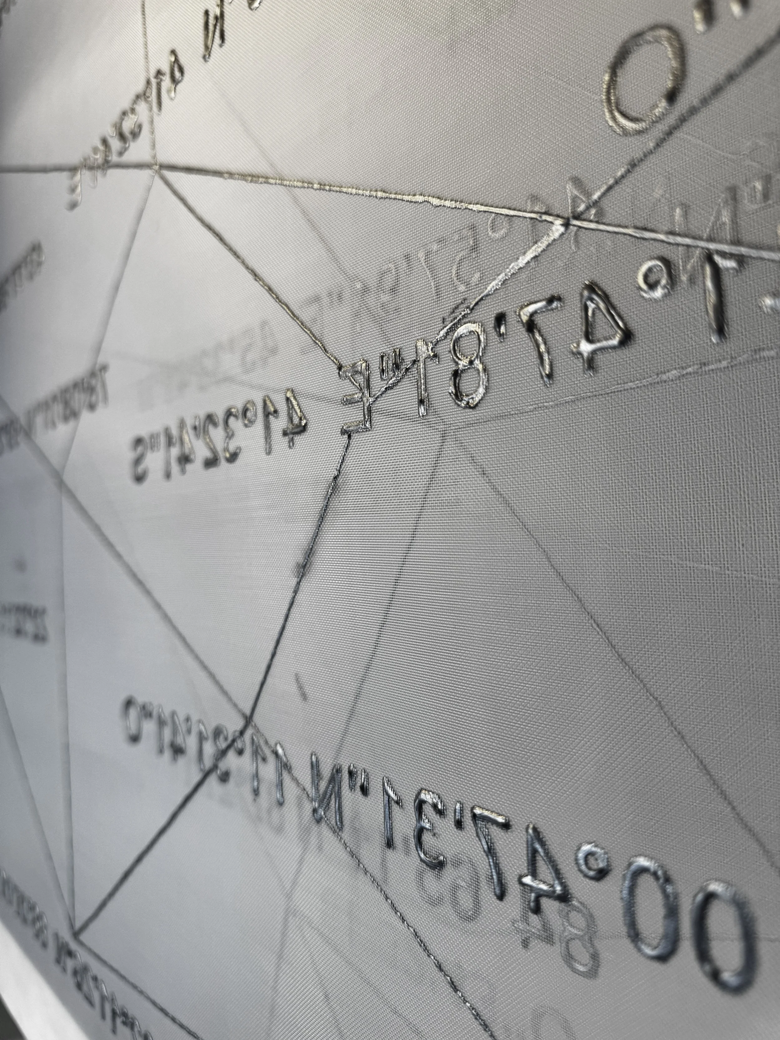 I temi, le considerazioni personali e di altri autori trovano una forma visiva in una mappa costituita da punti interconnessi attraverso linee, individuati da coordinate geografiche immaginarie. In questa cartografia della mente, tali punti corrispondono a luoghi concettuali alcuni dei quali si svelano in brevi frammenti di testo che costituiscono lo sfondo e la sostanza del pensiero. Le aree concettuali sono: archivio, lista, atlanti, memoria, arte, biogea, incertezza, oscurità, uccelli e pietre.
