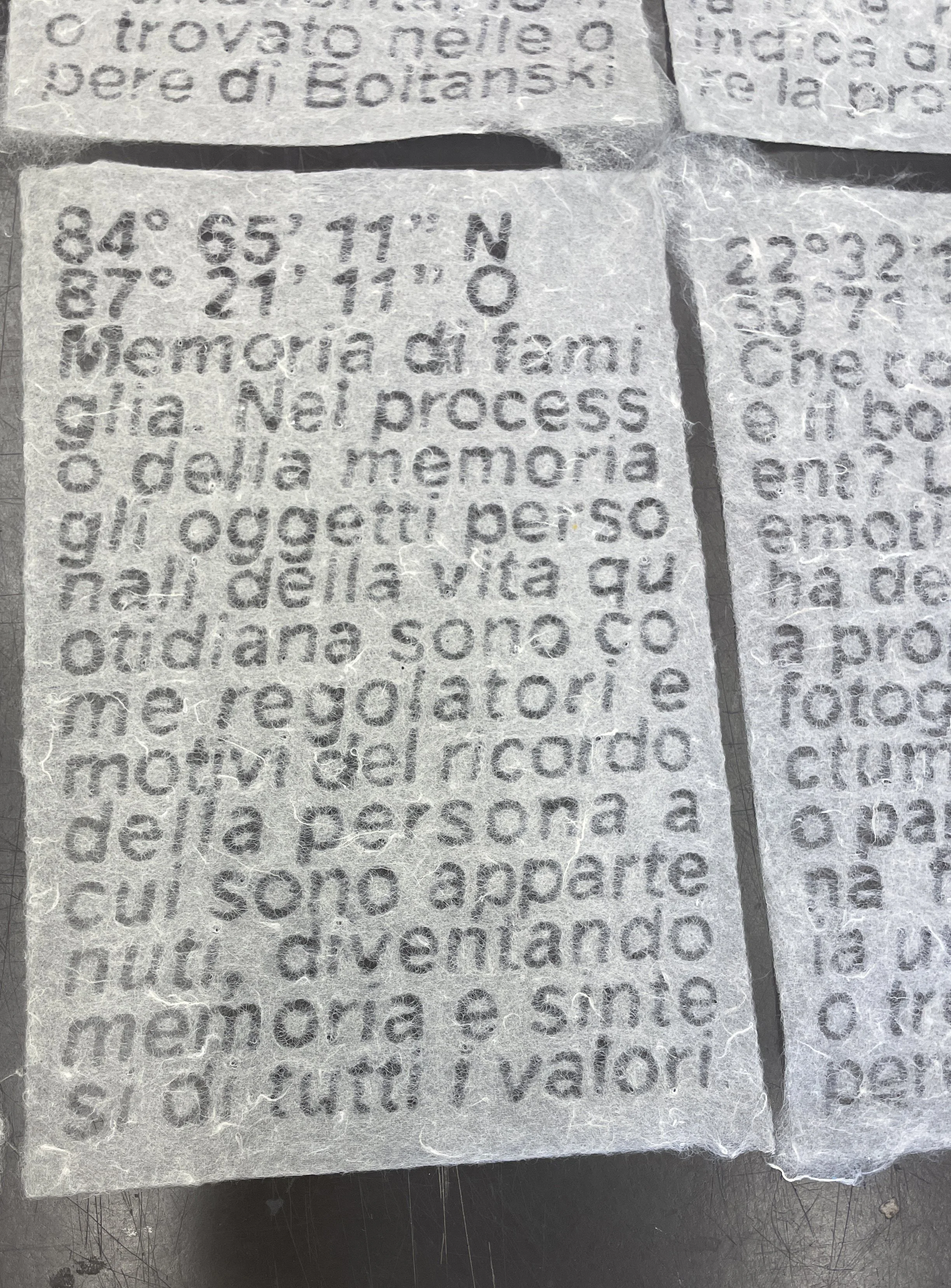 The themes, personal and other authors' considerations find a visual form in a map consisting of points interconnected through lines, identified by imaginary geographical coordinates. In this cartography of the mind, these points correspond to conceptual places some of which are revealed in short fragments of text that form the background and substance of thought. The conceptual areas are: archive, list, atlases, memory, art, biogea, uncertainty, darkness, birds and stones.